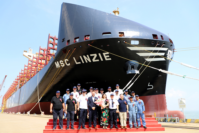 9月4日,我集團(tuán)與地中海航運共同為新船舉行了命名祈福儀式。命名人Martyna Orzechowska女士,地中海航運新造船部門駐揚子鑫?,F(xiàn)場辦經(jīng)理羊海濤先生,我集團(tuán)總經(jīng)理助理兼揚子鑫福造船總經(jīng)理楊雪彥先生,挪威船級社江陰站靖江部門經(jīng)理莊華平先生,以及船東監(jiān)造組、船檢、船廠、船員相關(guān)人員代表及嘉賓出席了儀式。命名人Martyna Orzechowska女士將新船命名為“MSC LINZIE”輪,為新船砍纜、擲香檳禮、拉響汽笛,并與船長共同在新船畫框上署名留念,祝福隨船船員航行平安,為船東和租家?guī)順s譽和財富。